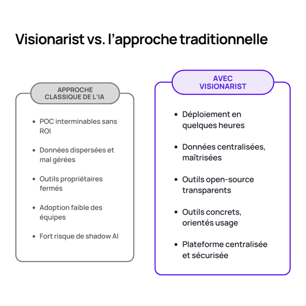 Et devinez quoi ? C’est exactement ce que Visionarist propose : un environnement où vous déployez rapidement des solutions adaptées à votre métier, avec vos propres données, tout en bénéficiant de modèles open-source éprouvés. Le résultat ? Vous rejoignez les 5 % de projets qui réussissent.